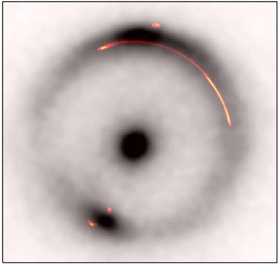 Immagine di Cover. Sovrapposizione dell’emissione infrarossa (in bianco e nero) con l’emissione radio (a colori) dell’arco gravitazionale del sistema JVAS B1938+666. L’oggetto oscuro e di piccola massa si trova nel vuoto nella parte luminosa dell’arco sul lato destro. Crediti: Keck/EVN/GBT/VLBA/John McKean