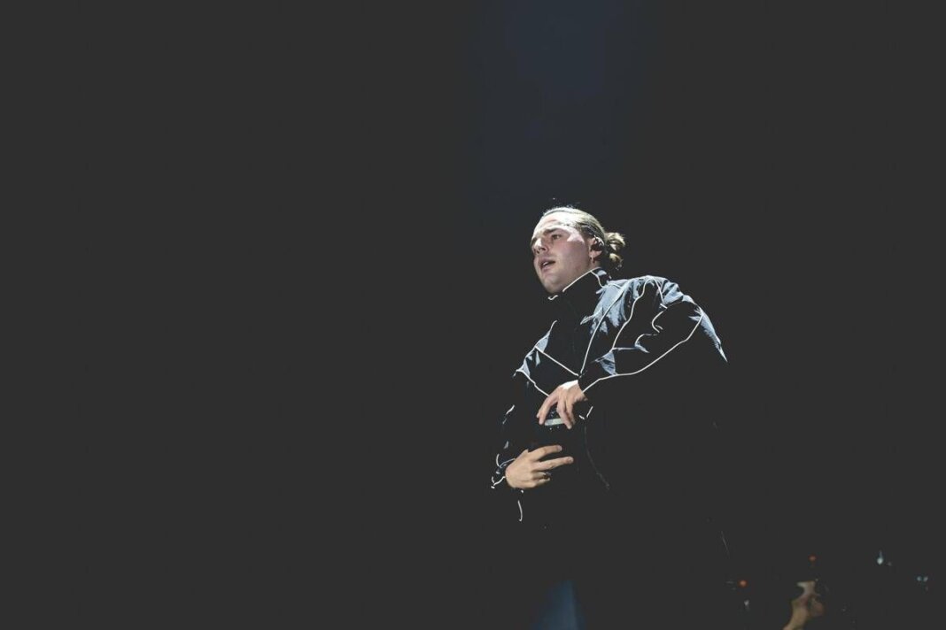 Entra con una certa ‘aura’, scomodando i tifosi di Jannik Sinner. Prima ancora della prima nota, cattura tutta l’attenzione. Total black: giacca di pelle, scarponcini e il suo immancabile codino. Sì, esatto, che aura. Canta, ma soprattutto racconta. Perché prima di essere un rapper è un narratore di realtà. Nei suoi testi si leggono un passato turbolento, legami familiari complessi, dolore e voglia di riscatto. Ernia parla e il pubblico ascolta.