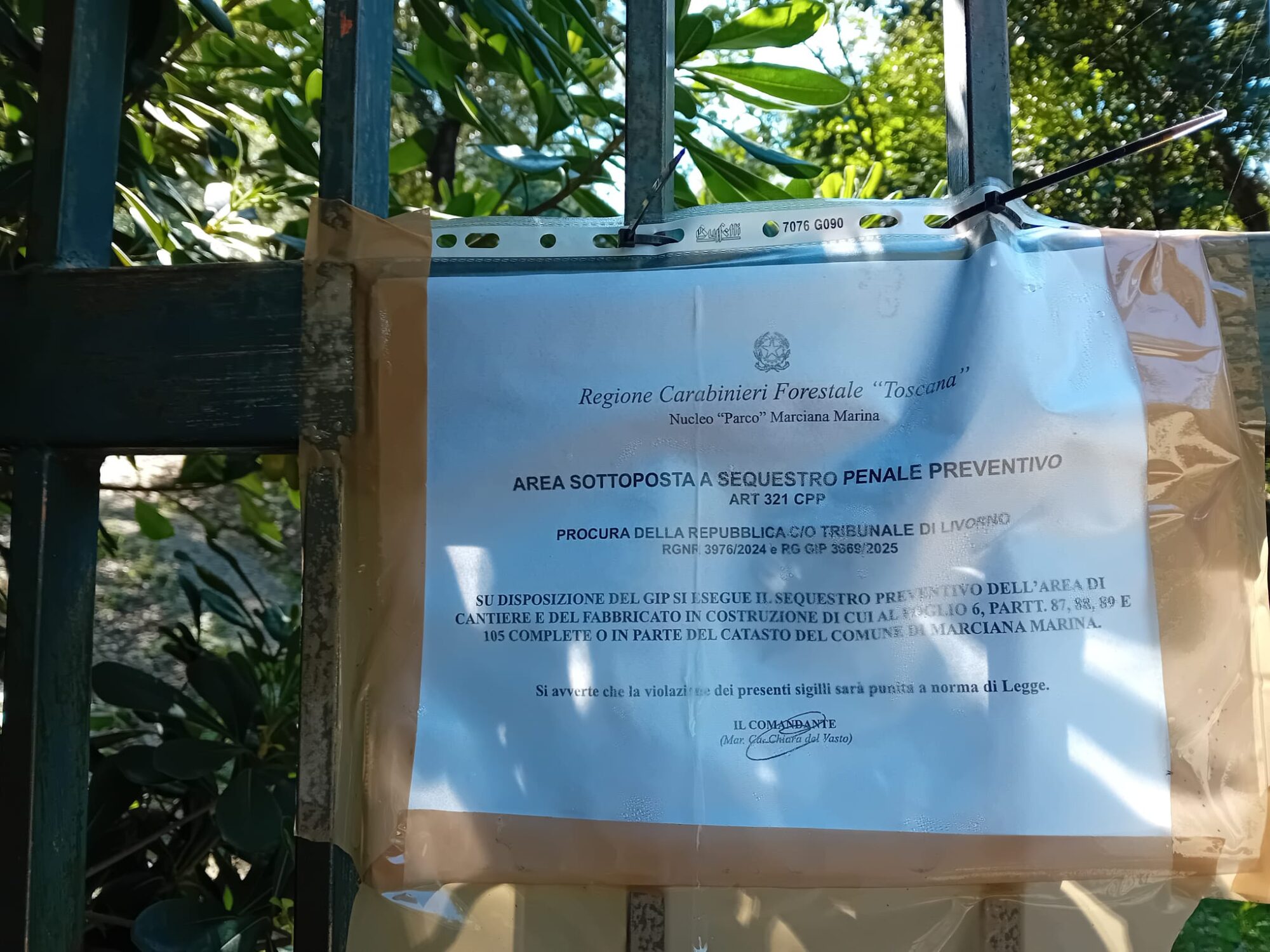 È il secondo in poche settimane, in area fuori parco nazionale ma Zsc e Zps. Su disposizioni del Giudice per le indagini preliminari (Gip), il nucleo “parco” Marciana Marina della Regione Carabinieri Forestale Toscana”ha sottoposto a sequestro penale preventivo, in base all’articolo 321 del codice di procedura penale, l’area di cantiere e un fabbricato in costruzione lungo la via dei Pini (meglio conosciuta come strada di Lavacchio). I cartelli del sequestro preventivo eseguito dai carabinieri forestali sono comparsi da qualche giorno sia sul cancello che separa la costruzione dalla strada che sottostrada nell’area boscata.