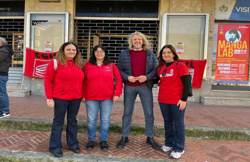 Prima di incontrare i giornalisti i rappresentanti della Slc-Cgil (presenti il segretario generale Samuele Falossi insieme a Tamara Garbuglia, Samantha Iannone e Francesca Soli) hanno effettuato un volantinaggio in zona mercato per sensibilizzare i cittadini sulla questione.