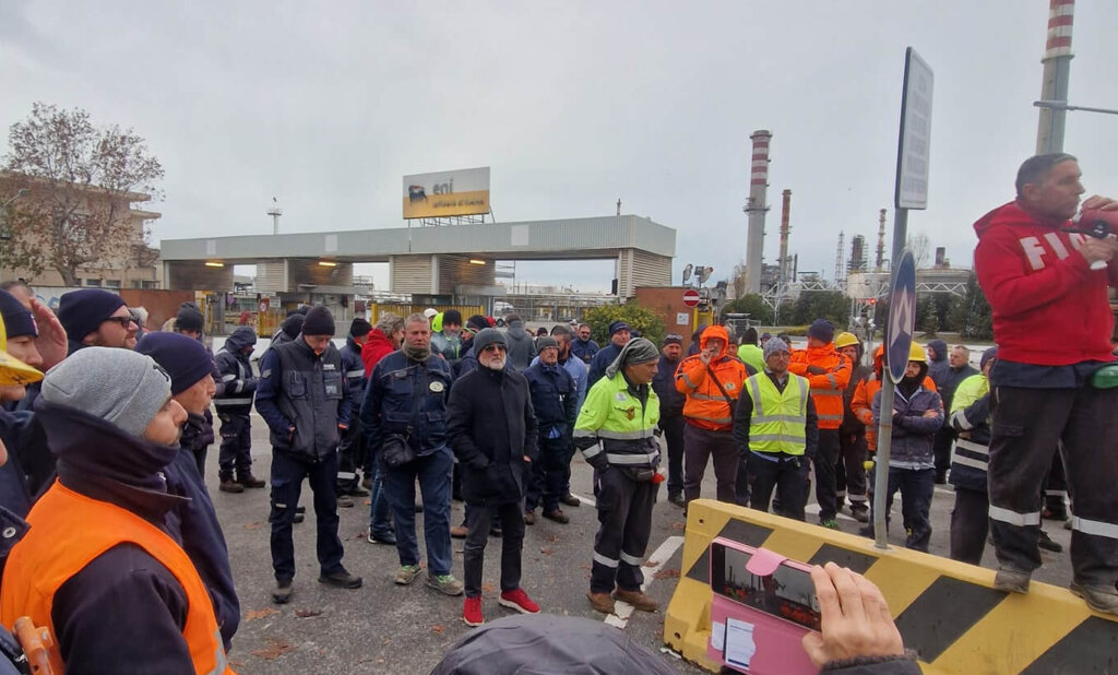 Almeno 500 lavoratori martedì 10 dicembre mattina si sono riuniti in assemblea davanti ai cancelli della raffineria Eni.