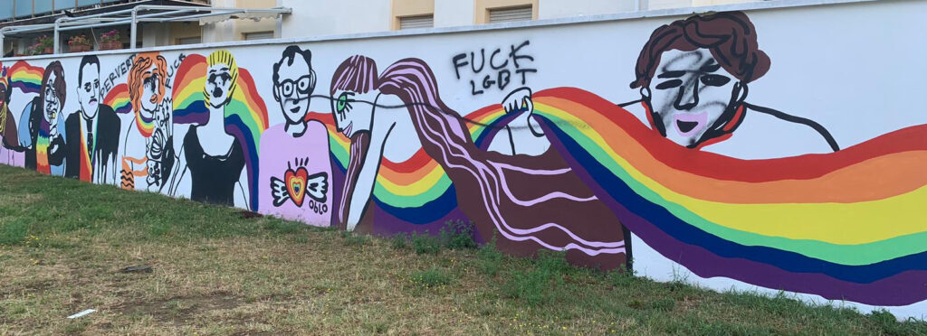 ‘Fuck Lgbt’ e ‘Pervert’ con spray nero sono apparse oggi sabato 1 luglio sul murale