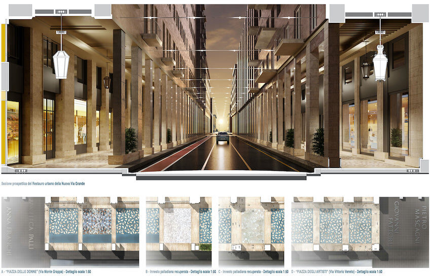 L’idea progettuale di Ipostudio è stata quella di partire dalla strada, uniformando tutto l’asse. Sono state analizzate le tipologie dei grandi palazzi e dell’architettura esistente contemporanea e storica.