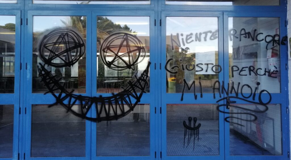 Con questa scritta spray corredata da disegno è stato imbrattato l’ingresso dell’istituto superiore Einaudi – Ceccherelli di Piombino.