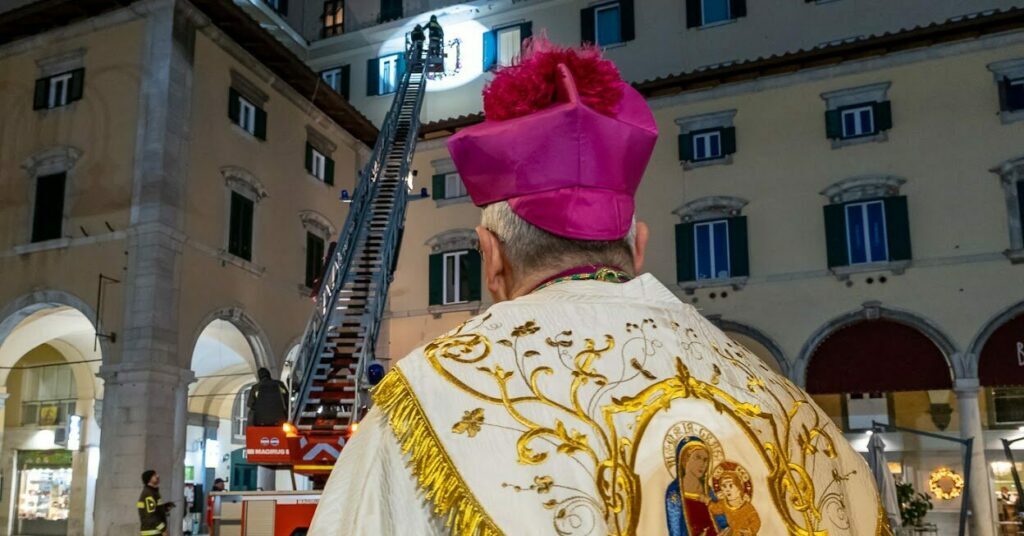 Don Donato presenta la cerimonia di sabato 27 gennaio: “Ci si raduna abitualmente alle 17.30 nella centralissima piazza Grande, dove il nostro Vescovo recita il Santo Rosario, dinanzi all’immagine della Madonna posta sopra i portici, che si confonde tra le finestre del palazzo su cui è affissa e che non tutti notano, se non vi si pone particolare attenzione. Ci si avvale anche del prezioso contributo del Corpo dei Vigili del Fuoco che, durante il momento di preghiera, appongono un omaggio floreale intorno all’immagine della Madonna, avvalendosi dei loro mezzi di servizio.