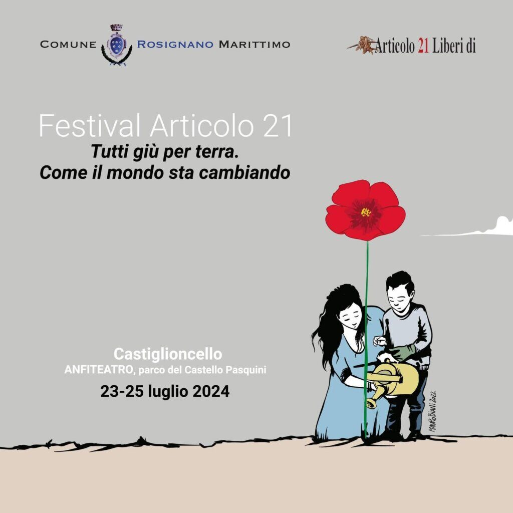 “Tutti giù per terra. Come il mondo sta cambiando” è il titolo delle tre giornate della terza edizione del Festival Articolo 21, in programma il 23, 24 e 25 luglio nell’anfiteatro Giuliano Scabia nel parco del Castello Pasquini, a Castiglioncello . Tre gli appuntamenti per cercare di capire che cosa sta accadendo a livello internazionale e come la politica sta cambiando.