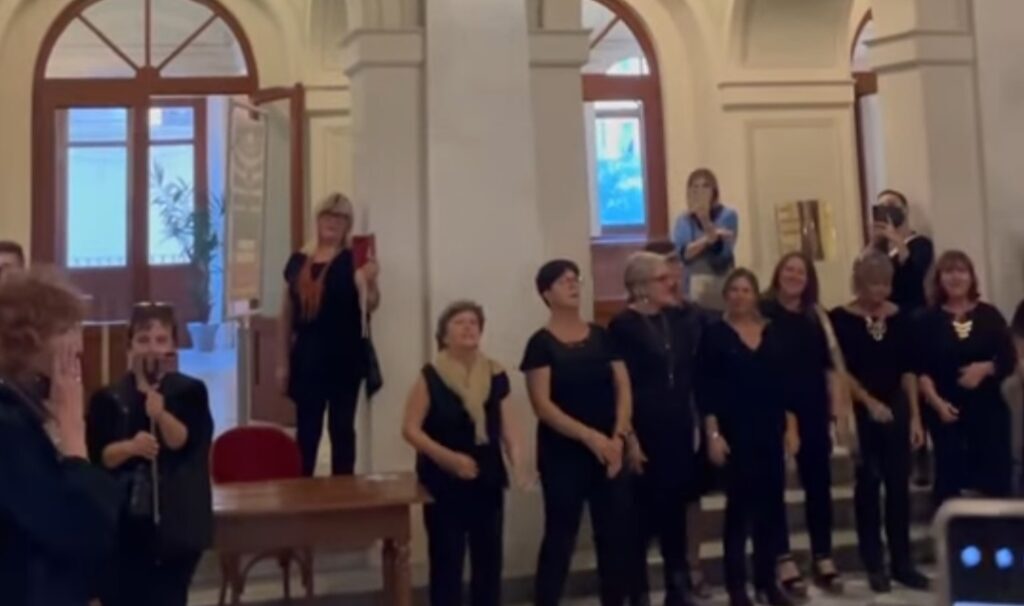 L’artista romana ha postato sui suoi profili social il video con i’esibizione insieme al coro che si è commosso insieme a lei nel foyer del Goldoni.
