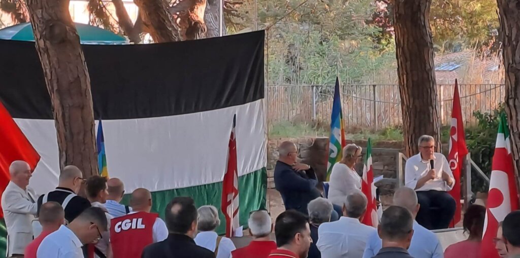 LIVORNO – La bandiera della Palestina alle spalle del palco per Maurizio Landini a Livorno per presentare il suo libro ‘Un’altra storia’.