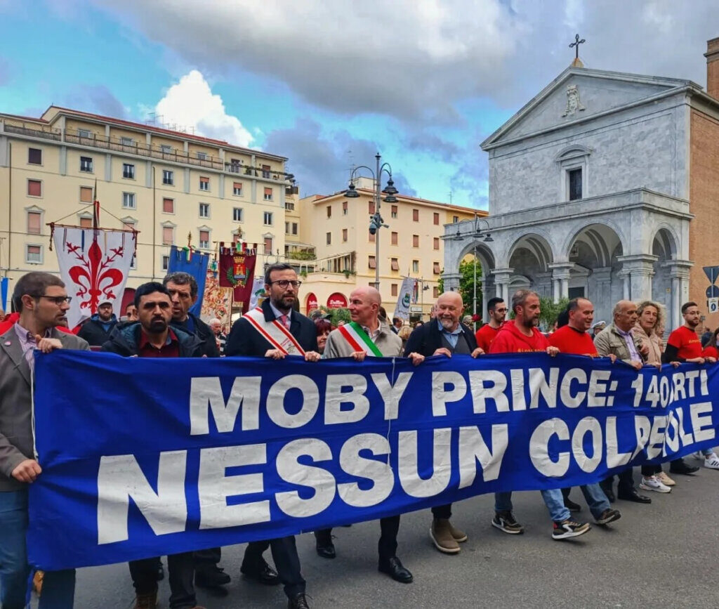 Dopo l’iniziativa in Comune il corteo per le vie del centro con il momento culminate del lancio delle rose in mare al porto mediceo, dove si trova la lapide con i nomi, delle vittime del Moby Prince.