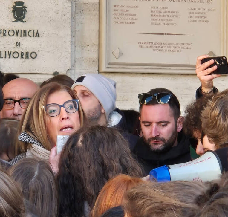 Sandra Scarpellini, presidente della Provincia di Livorno, dopo la protesta degli studenti finita con forti tensioni davanti a Palazzo Granducale, come sottolinea via social la stessa presidente, sindaca di Castagneto Carducci, uscita per parlare con i manifestanti.