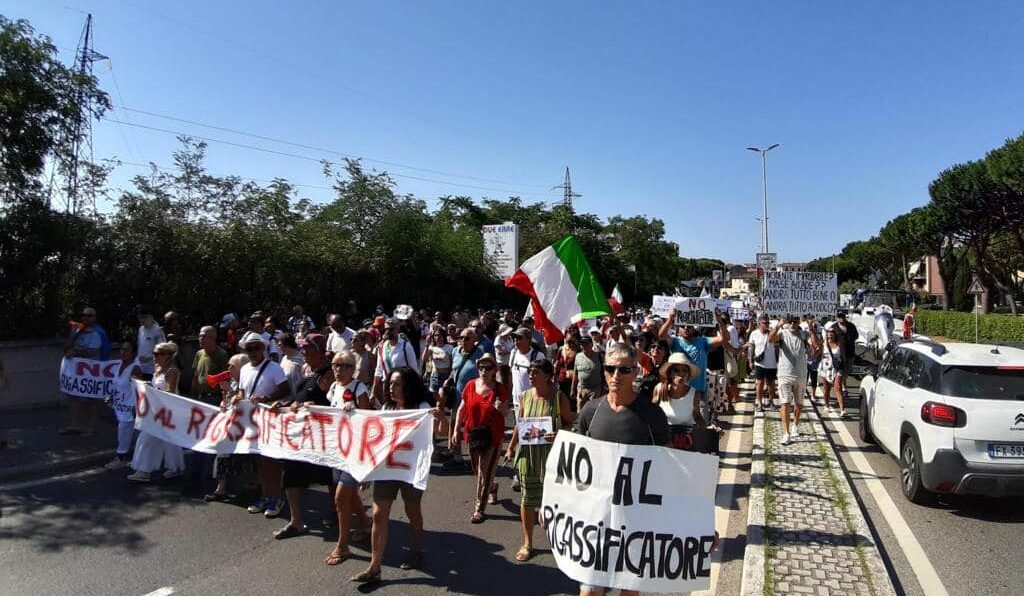 Una Piombino in rivolta, con cittadini, comitati e partiti che sabato scorso sono scesi in piazza insieme al sindaco Ferrari per dire ancora una volta no al rigassificatore in porto.