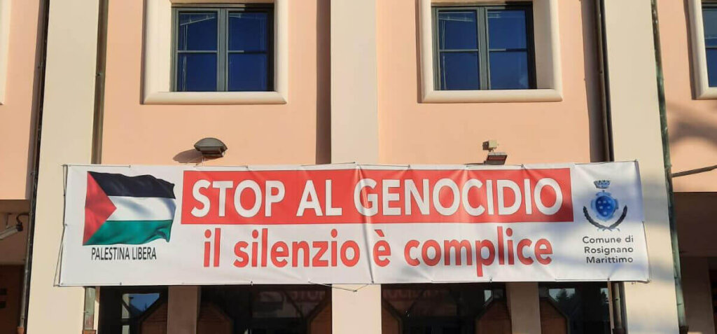 ROSIGNANO MARITTIMO – ‘Stop al genocidio. Il silenzio è complice’. Il Comune di Rosignano Marittimo, sindaco Claudio Marabotti, espone nuovamente lo striscione di solidarietà per la Palestina. Con tanto di stemma del Comune in provincia di Livorno da un lato, e di bandiera Palestina dall’altro. Lo striscione è stato esposto sulla facciata della centrale struttura comunale in piazza del Mercato a Rosignano Solvay.