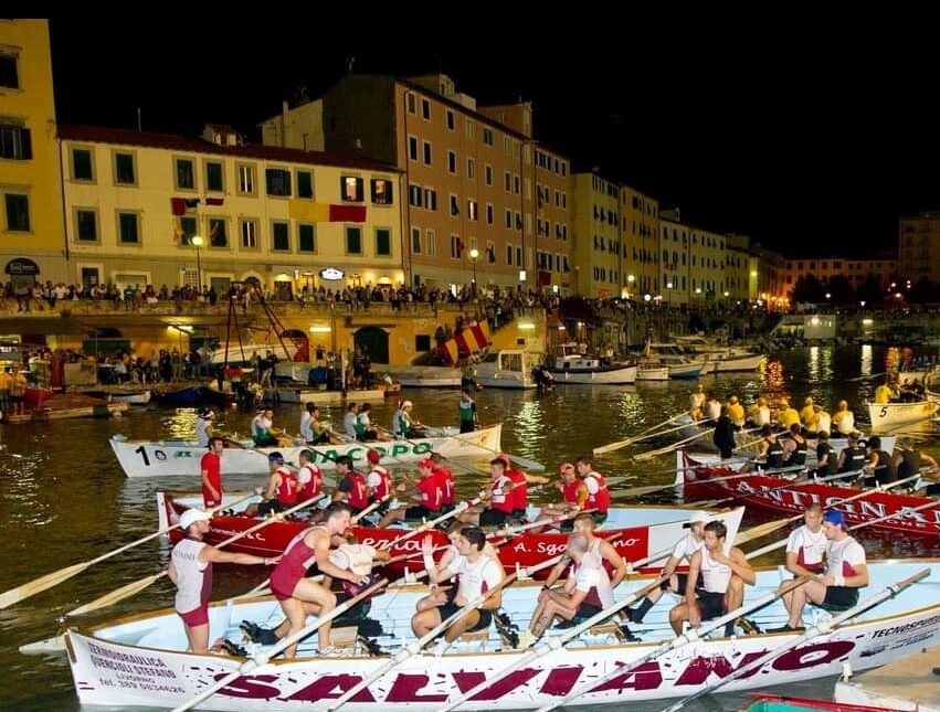 Sfida in notturna tra le più spettacolari nelle acque dei fossi medicei di Livorno tra i gozzi a dieci remi che rappresentano i rioni della città.