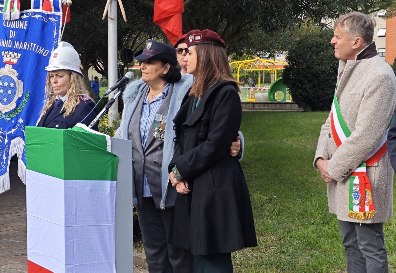 Sono stati il sindaco Marabotti e il sindaco Perrotta a scoprire poi il cippo, che fino quel momento era rimasto nascosto sotto il tricolore. Subito dopo è stata deposta dal vicesindaco Mario Settino e dall’assessora Cristina Santinelli una corona di alloro.