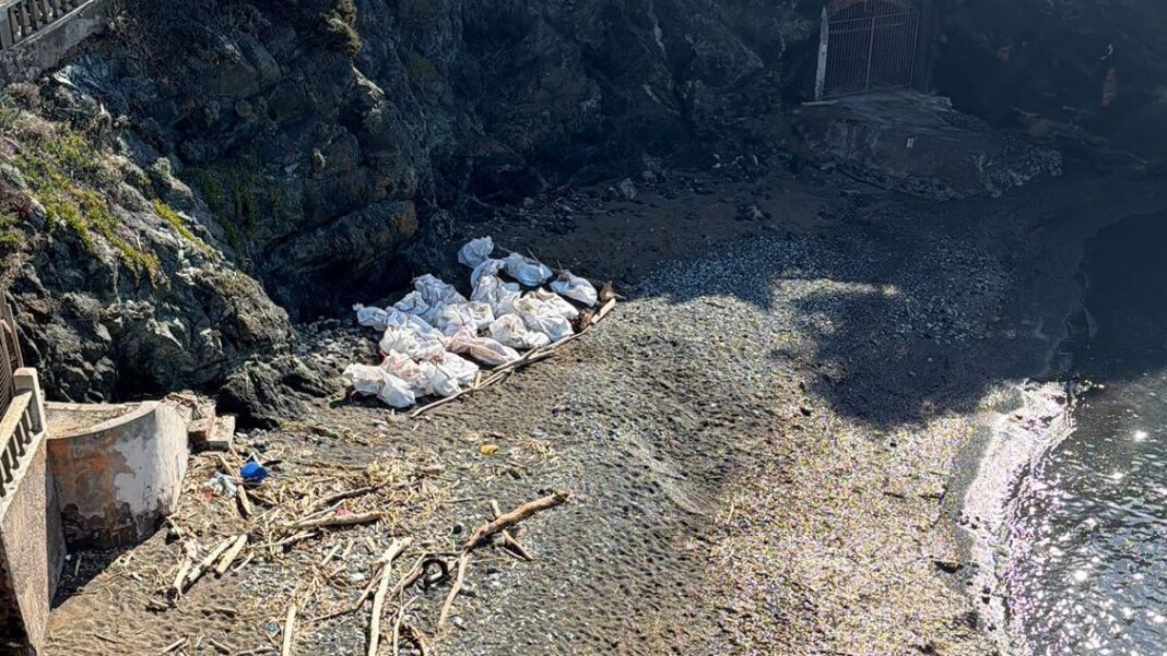 ROSIGNANO MARITTIMO – Si sono concluse le operazioni di sezionamento della carcassa del capodoglio morto, spinto dalle mareggiate della scorsa settimana nella piccola baia di Santa Lucia a nord di Castiglioncello. La ditta specializzata che ha effettuato l’intervento ha già ‘imbustato’ in appositi sacchi ermetici i resti del cetaceo che ora devono andare allo smaltimento. I grandi sacchi sono stati posizionati accanto alle rocce in un punto della piccola baia abbastanza distante dalla linea di battigia.