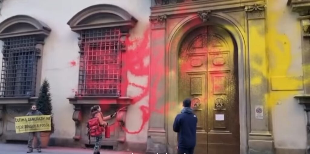 FIRENZE – Ultima Generazione imbratta con la vernice gialla e rossa la sede del Consiglio regionale della Toscana.