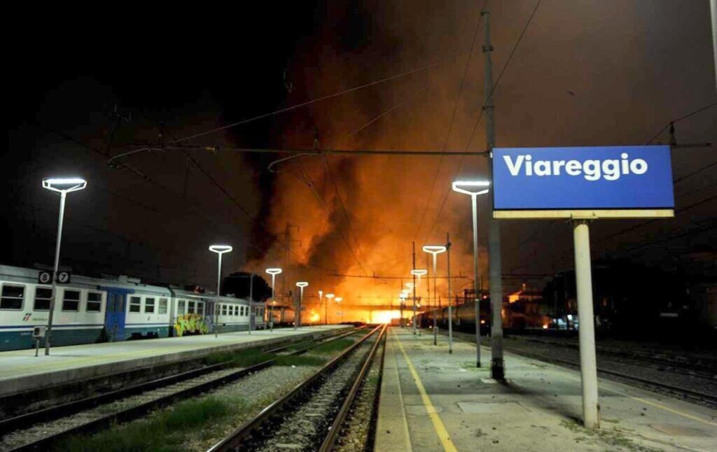 Il disastro ferroviario alle 23.48 del 29 giugno 2009. Un treno merci composto da 14 cisterne cariche di gpl deragliò con fuoriuscita del materiale infiammabile. L’esplosione, l’enorme incendio che avvolse la stazione di Viareggio, le auto, le case circostanti.