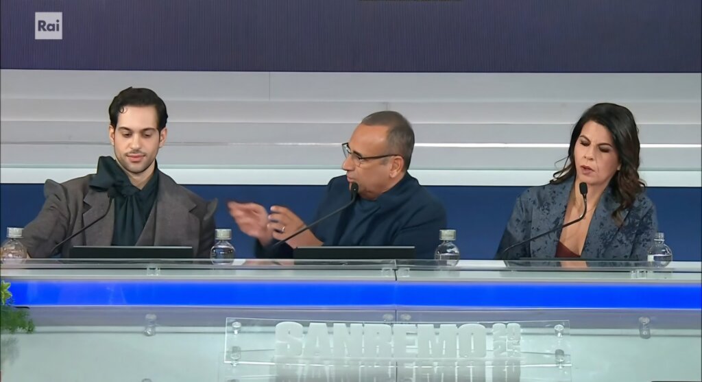 Serata che vede Geppi Cucciari e Mahmood conduttori con il direttore artistico Carlo Conti sul palco dell’Ariston