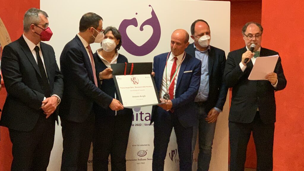 Antonio Arrighi, produttore dell’Isola d’Elba padre del vino marino Nesos, insignito del Premio Angelo Betti Benemerito della Vitivinicoltura 2022 con la Medaglia di Cangrande dalla vicepresidente e assessore all’agricoltura della Regione Toscana Stefania Saccardi e dal ministro Stefano Patuanelli. La cerimonia di consegna delle onorificenze al Vinitaly 2022 a Verona.
