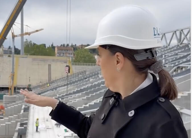 FIRENZE – Il cantiere dello stadio Artemio Franchi di Firenze avanza a ritmo serrato. La sindaca Sara Funaro, accompagnata dall’assessora allo sport Letizia Perini, ha effettuato un sopralluogo per verificare lo stato di avanzamento dei lavori, confermando che il montaggio dei gradoni della nuova curva Fiesole sta procedendo in linea con il cronoprogramma stabilito.